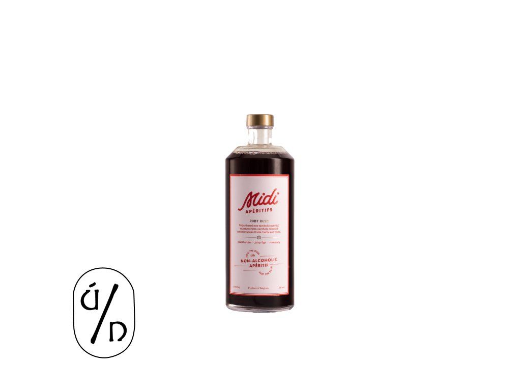 Midi Ruby Rush je svěží a šťavnatý nealkoholický aperitiv postavený na verjusu – šťávě lisované z nezralých hroznů. Ovocný základ je doplněn o ostružiny, fíky a rozmarýn, které vytváří bohatý a živý chuťový profil.